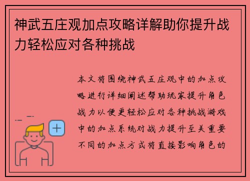 在《龙之谷》中,狙翎作为一个远程物理输出职业,以高爆发和灵活的机动性著称。为了更好地提升战斗力,合理的加点和技巧至关重要。本篇文章将为玩家们提供详细的狙翎加点推荐和技巧解析,帮助大家在游戏中提高角色的战斗力。文章将从四个方面进行详细的阐述,包括狙翎的技能加点选择、属性加点的重要性、装备搭配建议和实战...