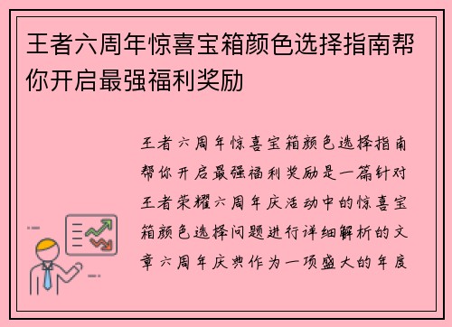 王者六周年惊喜宝箱颜色选择指南帮你开启最强福利奖励
